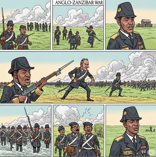The shortest war in history happened on August 27, 1896, between Britain and Zanzibar. It lasted only about 38 minutes. The conflict started when the Sultan of Zanzibar, Hamad bin Thuwaini, died. Britain wanted the new ruler to be someone friendly to them. But another man, Khalid bin Barghash, took the throne without British approval. The British gave him an ultimatum to step down. He refused, and instead gathered his soldiers and artillery near the palace. At 9:02 a.m., British warships began to fire at the palace. By 9:40 a.m., the palace was in ruins, and Khalid fled to the German consulate. More than 500 Zanzibaris were killed or wounded, while only one British sailor was injured. Afterward, Britain placed their chosen sultan on the throne. This tiny war shows how powerful Britain was during the colonial period.